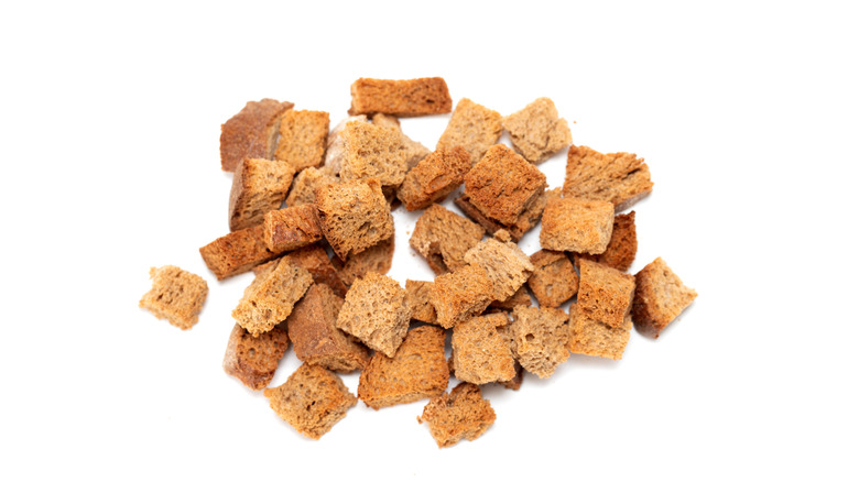 Croutons benefit from direct contact with the bottom of a hot baking sheet or skillet. They also rely on the hot air that circulates around them. When they're too close together or piled on top of each other, all of the croutons won't have contact with the pan or skillet. They also won't reap the benefits — crispy sides — of having space between them for the hot air to circulate. Instead, steam will build up in the pan and your croutons will be soft instead of crisp.