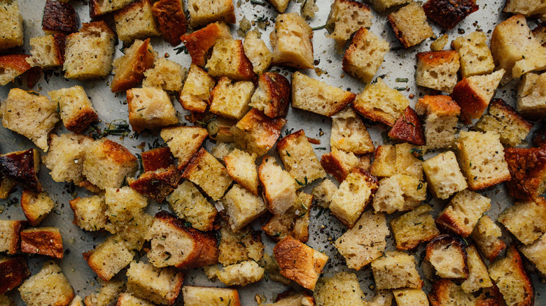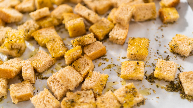 Store-bought croutons are convenient for adding a delightful crunch to everything from your favorite salads to creamy soups and rustic stuffing recipes. While they may be the easy alternative, when it comes to taste, homemade is best. Not only are homemade croutons a fresher, more flavorful alternative, making them yourself allows you to customize them to suit your tastes and the dish you'll be adding them to. The contents of your spice rack are your only limitation.