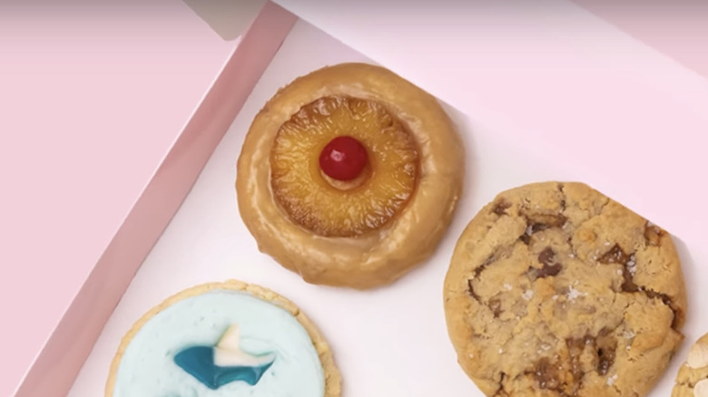 Speaking of clever toppings, this cookie featured a caramelized pineapple ring and a maraschino cherry — two ingredients that pay homage to a true pineapple upside-down cake. Fruit on top of a cookie can be a bit of a gamble, especially if the fruit is particularly juicy and leaves the cookie soggy. Sogginess certainly wasn't a problem with pineapple upside-down cake, however, and the pineapple ring was a delightful garnish with just the right amount of sweetness and juiciness. I can't fathom why Crumbl sent this cookie to an early grave, but between the cake-like base, delicious brown sugar glaze, and caramelized pineapple ring, a redemption arc is well-deserved.