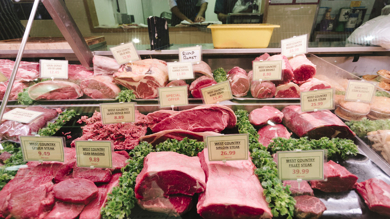 Because the hanger steak is such a small piece of the cow — it weights around a pound and a half — it's unlikely you'll see it on typical grocery store shelves. Each cow creates only one hanger steak, making it a low-yield cut. While the demand for hanger steak has undoubtedly grown, it's relatively unknown compared to more popular and abundant cuts of beef. For that reason, it is not commonly stocked in supermarkets. If you are seeking this desirable cut, check with a local butcher. After all, the hanger steak is often called "the butcher's steak" since butchers would frequently keep the cut for themselves.