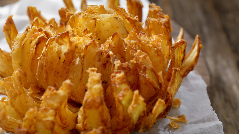 Of all the amazing steakhouse chain restaurants in the U.S., there's a little something to entice just about anyone's palate. From dedicated omnivores to vegetarians, the one uniting force that brings everyone together around the restaurant table is the blooming onion. An Outback Steakhouse staple — and one that is clearly superior to the "Cactus Blossom" Texas Roadhouse counterpart — the blooming onion has mystified diners as a steadfast, satisfying appetizer. If you've ever wondered if you too could properly slice, batter, and fry a whole onion at home, you'll be pleased to know that you can easily take this pleasing snack right out of its typical restaurant environment and into your home kitchen. All you need are a few handy tips and a desire to get creative.
