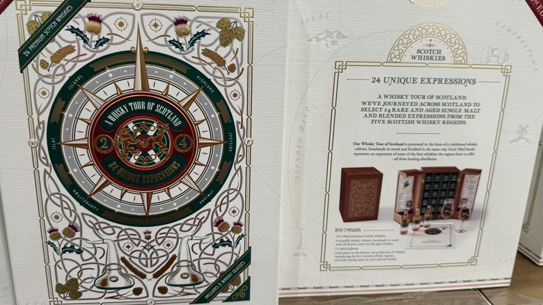 Just as it does with wine, beer, coffee, and imported cheese, the Costco whiskey advent calendar is a hallmark of the wholesaler's holiday season. This year, however, is a bit of an upgrade from the last — although that could depend on who you ask. In 2023, the world tour was much more dialed down geographically, focusing on whiskys sourced from all across Scotland. Unlike this year's box, some of the distillers were left undisclosed, but it did feature single and blended malts from the five major Scottish whiskey regions, including the Highlands, Lowlands, the Spyeside, Campbeltown, and the Islay.
