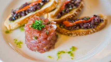 In this case, we're going to add anchovies, parsley, and chives, along with finely chopped capers that offer bursts of acidity and help cut through the fat of the fish, for a tuna tartare that will be the perfect start to any Italian menu. We're also skipping the soy and instead opting for a dressing of Dijon mustard, olive oil, and lemon juice. We'll then serve the dish with thin slices of toasted baguette and a glass of light Italian red wine.