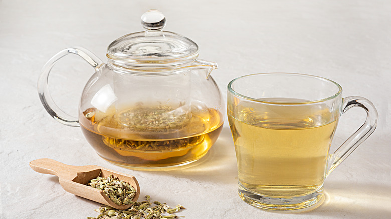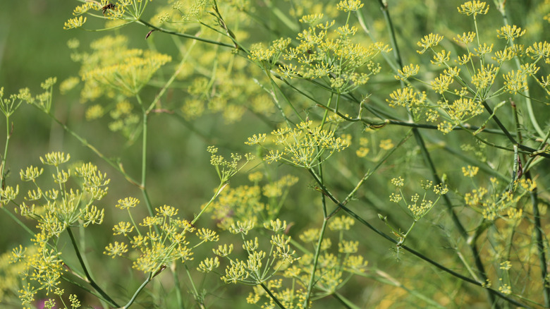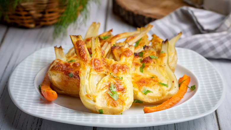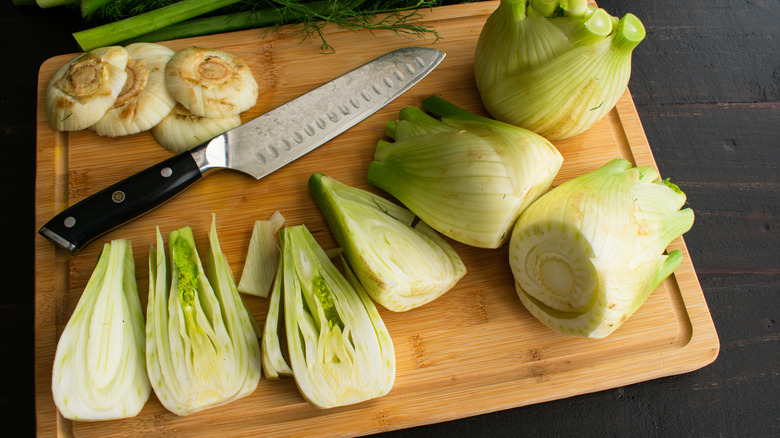 Those hearing about fennel for the first time are not alone. Although it's often found in gourmet cuisine, it's not a particularly expensive or bougie vegetable. It's a simple root vegetable found in the carrot family. Its official botanical name is Foeniculum vulgare, and it's best described as looking like a lumpy, large onion with firm green stalks and dill-like lacey leaves. The bulb is generally the size of about two white onions, melded together, and the stalks can be quite tall. At the grocery store, you'll find fennel with stalks about a foot tall or less, but they can reach up to six feet tall. Fennel can be classified as an herb, a vegetable, and a spice because of all the plant has to offer, from root to flower.