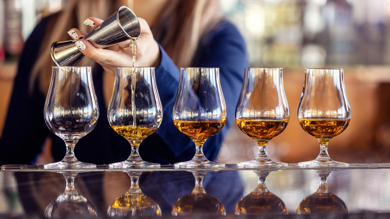 To make sure you're staying in check, Cary Ann Fuller recommends a quarter or half ounce pour at most if you're tasting a selection of four to five whiskeys. Shot glasses are typically 1.5 ounces, so depending on your selection you're looking at a bit less than two shots. This is especially worth noting if you're pouring higher proof bourbons. These can reach up to 160 proof, which is certainly greater than standard spirits which sit around 80 proof. Consequently, two shots can add up to a far stronger alcohol concentration than you might think depending on what's in your glass.