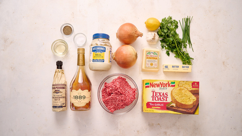 To make the caramelized onions, you'll need butter, a couple large Spanish (or yellow) onions, and a few tablespoons of brandy. From there, you'll need ground beef, Worcestershire sauce, oil, salt, and pepper to make the patties, then mayonnaise, garlic, chives, parsley, and lemon juice to put together the aioli. To finish the melts, you'll just need a box of frozen Texas toasts and a block of Fontina cheese for grating.