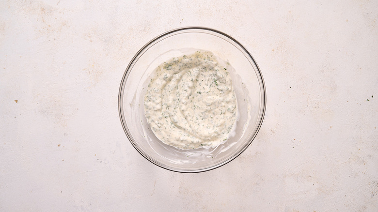 - Whisk together the mayonnaise, garlic, chives, parsley, lemon, and ¼ teaspoon each salt and pepper.