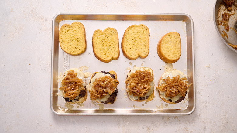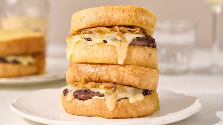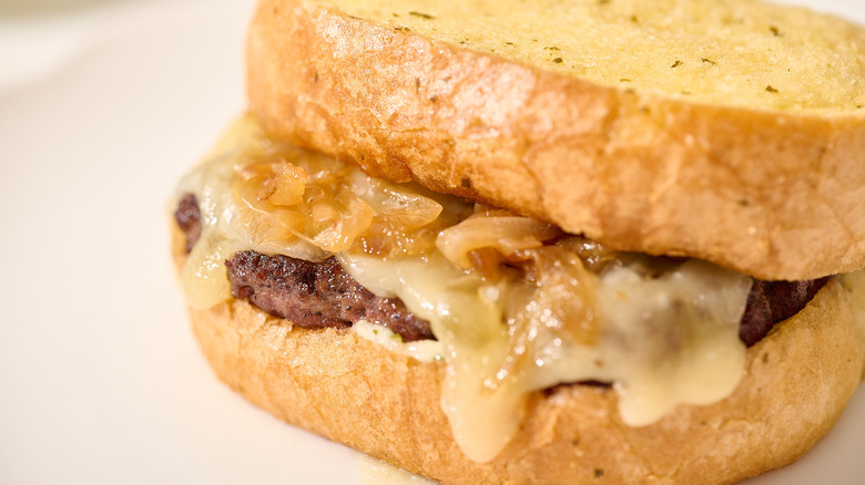 Though the garlic bread adds a flavorful, unique element to this patty melt, it is not required and can easily be swapped for other bread options. Another way you can elevate this patty melt is with a crusty Italian loaf or fluffy ciabatta. Brioche and challah bread work well, as they can both be thickly sliced and can hold the weight of the patty and onions. Avoid crumbly breads like focaccia for that reason — and as a last resort, use a thickly sliced white bread, making sure to toast it well so it doesn't fall apart.
