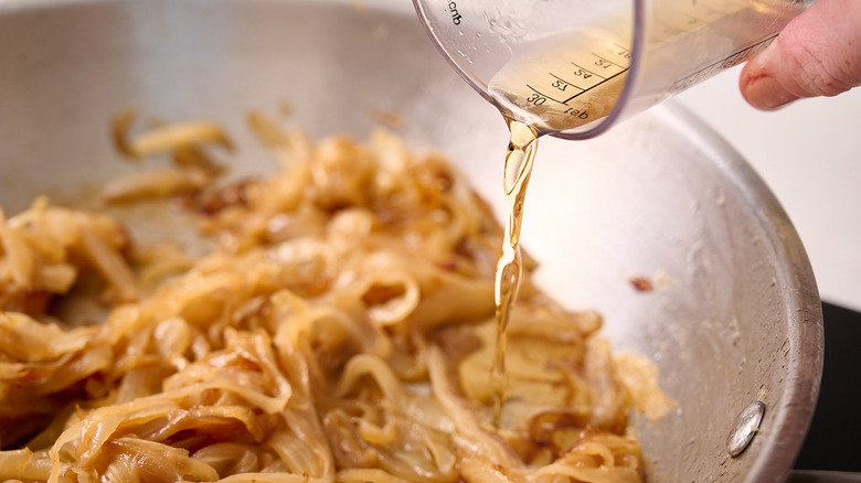 If you've caramelized onions before, you likely know that they don't require anything but a little bit of butter (or oil), and possibly some sugar or salt. Caramelizing onions isn't really about the ingredients, but rather, the technique, which requires a lot of patience — almost an hour's worth, in fact. The goal in caramelizing onions isn't just to brown the onions, but rather, to extract the sugars and caramelize them, in turn browning the onions into a sweet, jammy taste and texture. All you need for this is heat, but adding alcohol can make them a little bit more fun.