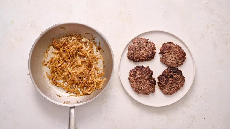 Remove and reserve the cooked patties and onions.
