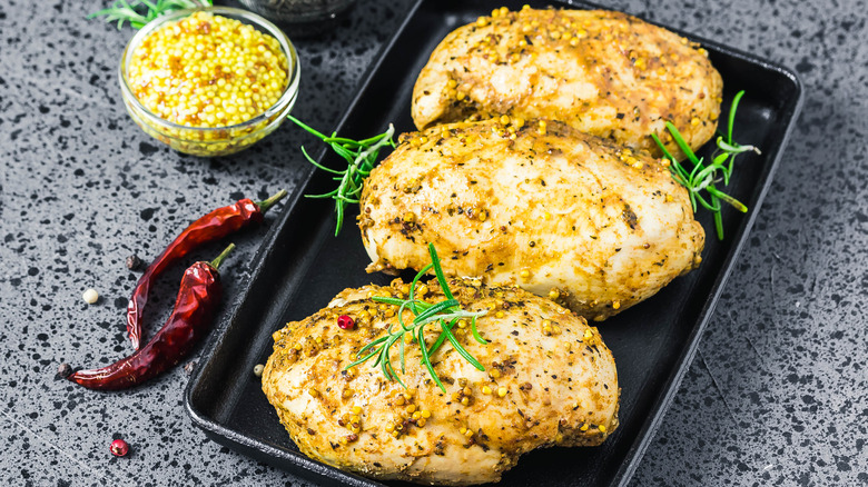 On the flip side, honey mustard sauce is fantastic for coating meat that's about to go on the grill (or in the oven). Using mayo to grill fish and meat is a known trick in the culinary world — mayonnaise is an emulsion so it sticks to the meat better than oil, preventing it from clinging to the grill or losing all the moisture during the cooking process. This is especially helpful when you're grilling delicate fish. Because honey mustard sauce is mayo-based, you can use it in place of plain mayonnaise to coat the meat before grilling it, with a slight adjustment: Grill the coated meat over indirect heat first, and only move it to direct heat for a nice sear at the end. Otherwise, the honey in the sauce could burn too quickly.