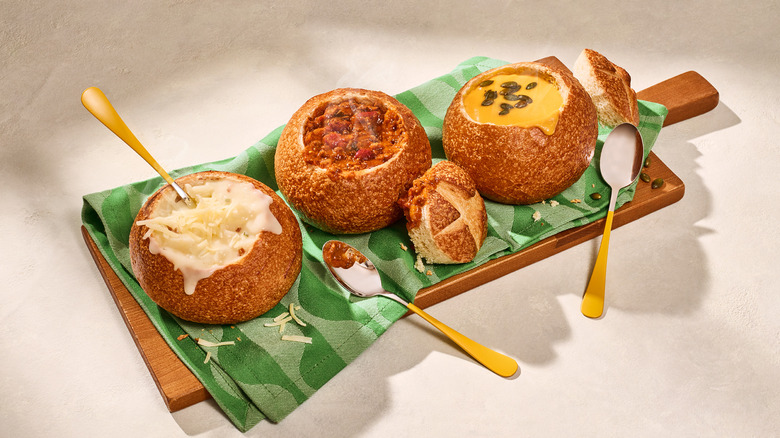 Aiming to emanate cozy fireside vibes as its name suggests, the Hearty Fireside Chili features a chili and cilantro broth filled with beef, fire-roasted tomatoes, and green chili peppers. This soup will warm you up from the inside, so you don't have to eat it while actually sitting by a fire. If you're in the mood for something creamy, go for the Rustic Baked Potato Soup. A Monterey Jack cheese sauce suspends homestyle cuts of bacon, potato, and chives — the best of all of the baked potato toppings. For those who have been waiting since last fall, the Autumn Squash Soup is back. This one has all of your favorite fall flavors: a creamy veggie broth with hints of honey, apple juice, and curry, simmered butternut squash and pumpkin, and roasted pumpkin seeds on top.