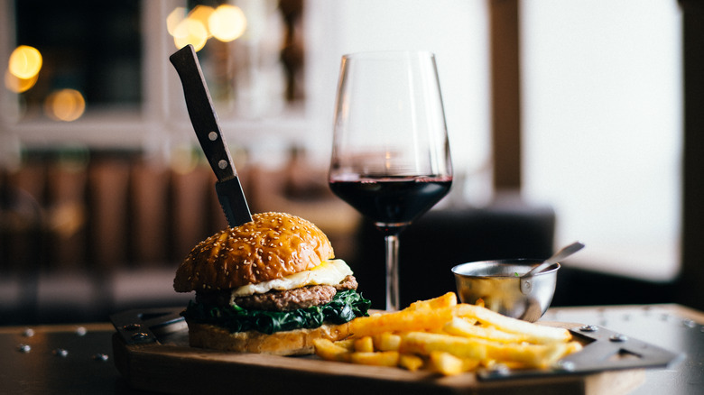 With its gamey taste, lamb already has enough flavor to bring out the best from syrah. However, if you want to spruce things up beyond just salt and pepper, our best lamb burger recipe is packed with plenty of flavor. Coriander and minced garlic cloves are mixed into the minced lamb — seasonings that will be further enhanced when consumed with the wine, just as chef Baki suggests. There's also a dash of lemon juice and Dijon mustard featured for tanginess. Most notable are the mint leaves, which bring a zesty, cooling effect to the hearty meat and rich wine.
