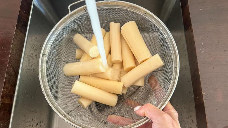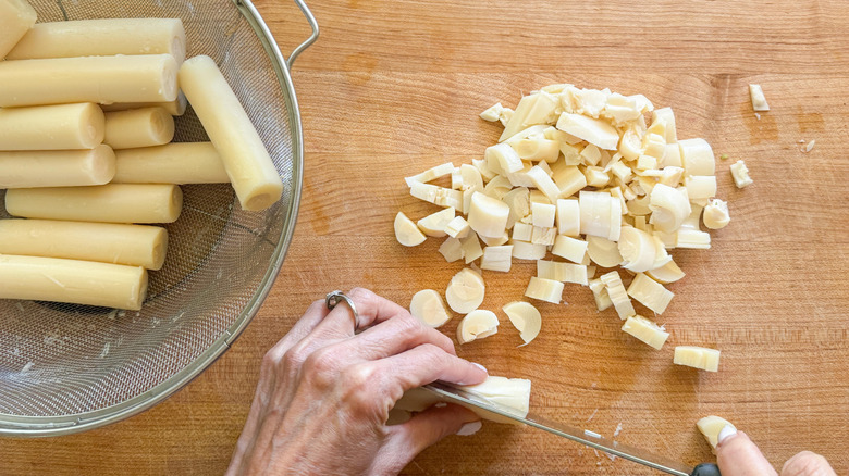 - Roughly chop the hearts of palm and add them to a large bowl.