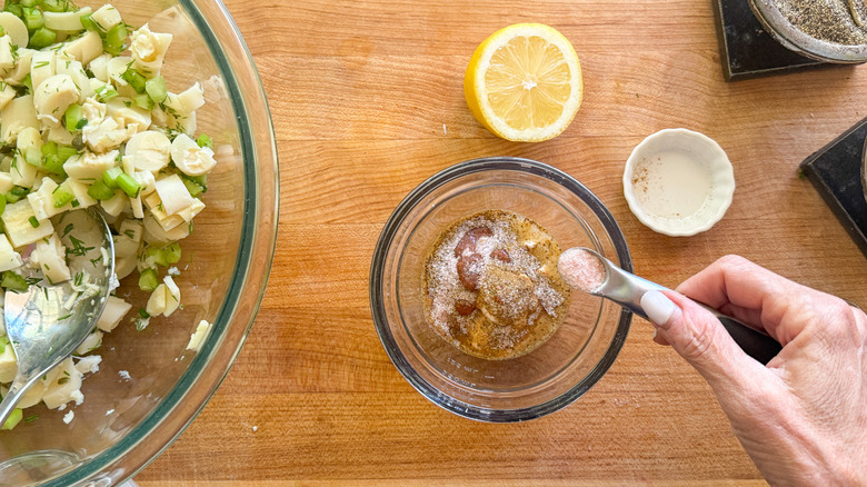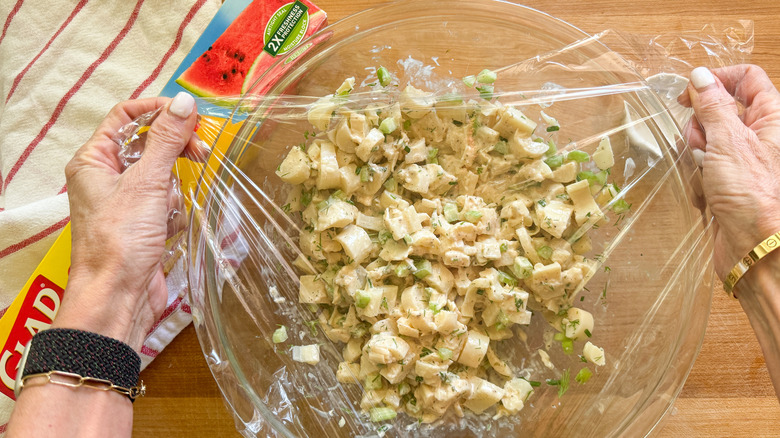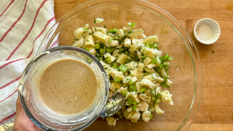 - Add the celery, dill, chives, and capers. Stir gently to combine.