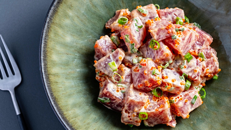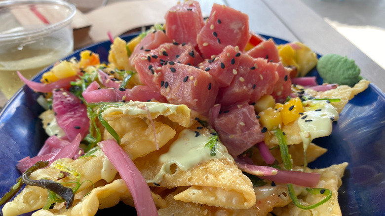 Tuna poke is a delicious food that's packed with pescatarian protein and nutrient-rich vegetables. Whether in a bowl of rice or stuffed into an avocado, this fish dish is an excellent anytime snack that's adaptable into many different forms. If you've got leftover ahi tuna poke and you're looking for a way to stretch it out into a truly crowd-pleasing meal, simply give it the nacho treatment. It's a lot easier than you think and will help your fish go the distance.