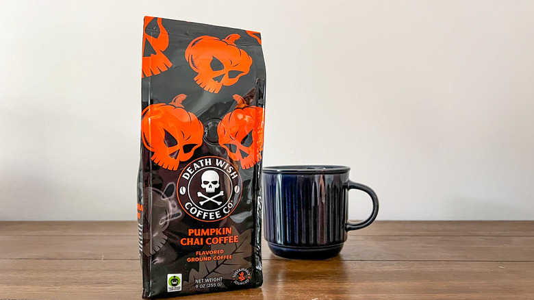 This one is for those hardcore coffee fans who want to forgo all the saccharine syrups and sweeteners that come with a pumpkin spice latte. Death Wish's Pumpkin Chai Coffee is a spice-forward bean blend roasted with cinnamon, cardamom, and nutmeg to create something akin to fall in a cup. Add pumpkin spice creamer to amplify the sweet notes from the roast or simply sip it black to soak up those warming spices. This fair trade-certified blend can be found seasonally at Kroger, Walmart, Sprouts, and other national retailers for around $11.99 per bag.