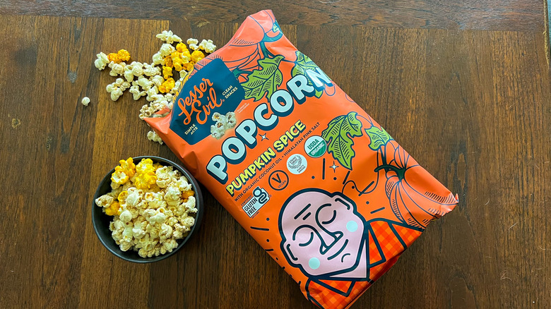 Popcorn may not be top of mind when it comes to picking out top pumpkin spice products, but LesserEvil seems to have cracked the code (or, rather, the corn) on packing fall flavor into a light and crunchy treat. LesserEvil's Organic Pumpkin Spice Popcorn is nothing short of aromatic spice-infused kettle corn made with organic coconut oil and brown rice syrup for a cleaner label that doesn't sacrifice taste. With its delicate balance of salty, sweet, and slightly spicy, we dare you not to eat the whole bag. LesserEvil's organic pumpkin spice popcorn can be found at Whole Foods, Kroger, on Amazon, and LesserEvil's website for around $4 per bag.