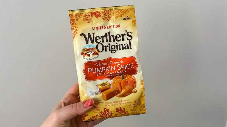 If you've never given the autumnal blend of pumpkin and caramel a try, these soft and satisfying candies from Werther's Original should be your first stop for a taste of seasonal indulgence. The 100-plus-year-old brand's classic soft caramel chews get an infusion of fall flavor with hints of savory pumpkin and warm spices like cinnamon, nutmeg, and clove. As expected with a gooey caramel candy, this one is more sugar-forward than some other pumpkin spice-flavored treats, but that's not necessarily a bad thing. One piece will satisfy even the biggest sweet tooth, leaving plenty of candy to share with family, friends, and even the pumpkin-averse. Pick up a bag at Walmart, Kroger, or Walgreens for around $3.99.