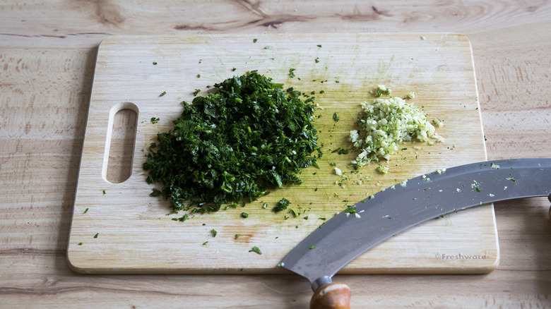 - To make the chimichurri, first use a chef's knife or mezzaluna to chop the parsley as finely as you can and finely mince the garlic. Make sure you have ½ cup chopped parsley. Transfer the parsely and the garlic to a small bowl.