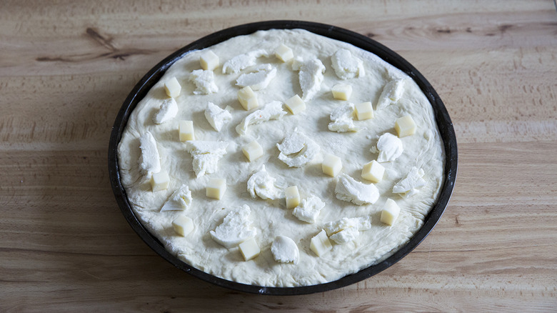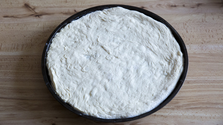 - Sprinkle the cornmeal onto a circular baking pan or grease the pan with oil. Place the dough in the pan.