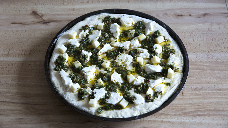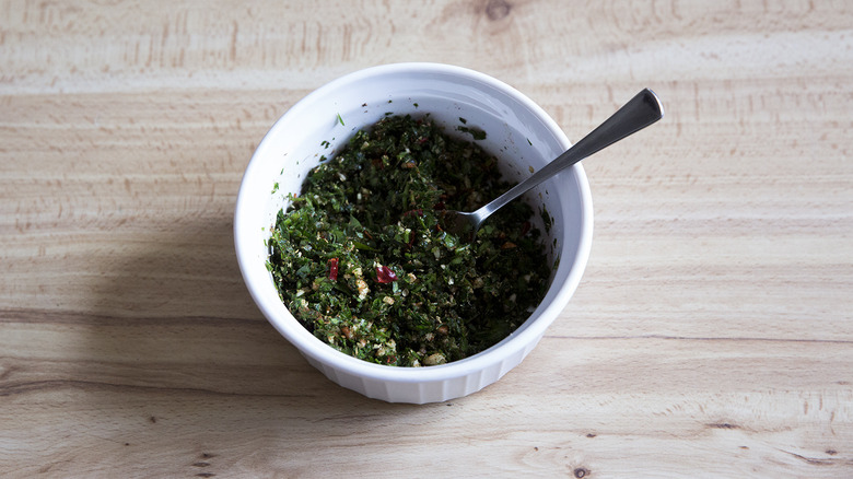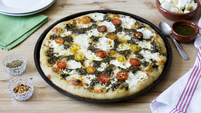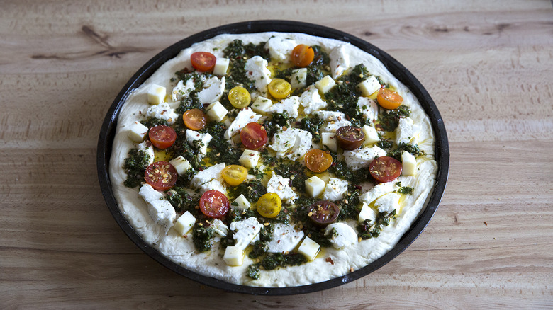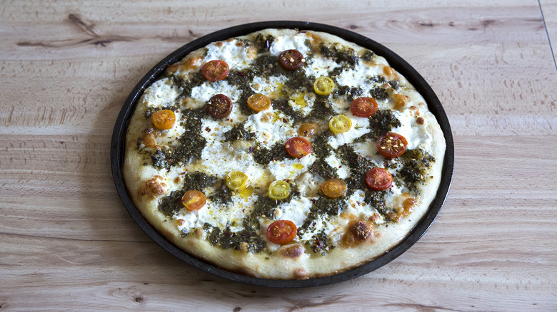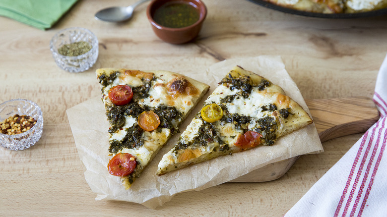 Recipe developer Michelle Bottalico has created a recipe for Argentine-inspired chimichurri and tomato pizza that's packed with significant flavor. Besides chimichurri, the pizza is topped with cherry tomatoes, oregano, crushed red pepper, mozzarella, and sharp provolone. The dish nods to the decadent Argentine dish provoleta, which consists of melted provolone mixed with oregano and crushed red pepper. Bottalico notes that this chimichurri recipe contains half the olive oil it normally does to prevent the pizza from becoming too saturated, so double the oil if you're making it for other uses. On chopping, she adds: "It may seem like time saver, but don't make chimichurri in the food processor. It's not supposed to be a puree. Finely chopping the ingredients by hand will preserve important texture."