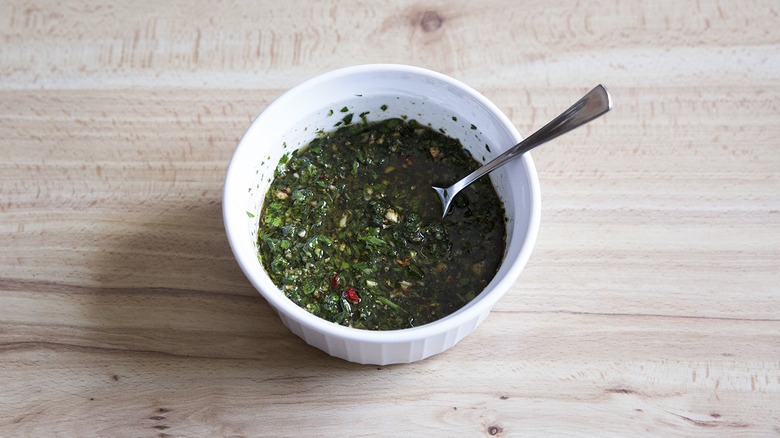 There is not just one way to prepare chimichurri. Like many traditional condiments, it can turn out differently depending on who's making it. In addition, there are several popular varieties of chimichurri that feature different principal ingredients. What the versions have in common is that they are green, oily, and flavorful. The parsley chimichurri recipe in this recipe can be modified into cilantro chimichurri by changing the main herb. Another kind of cilantro chimichurri leaves out the oregano and adds one whole onion per bunch of cilantro.