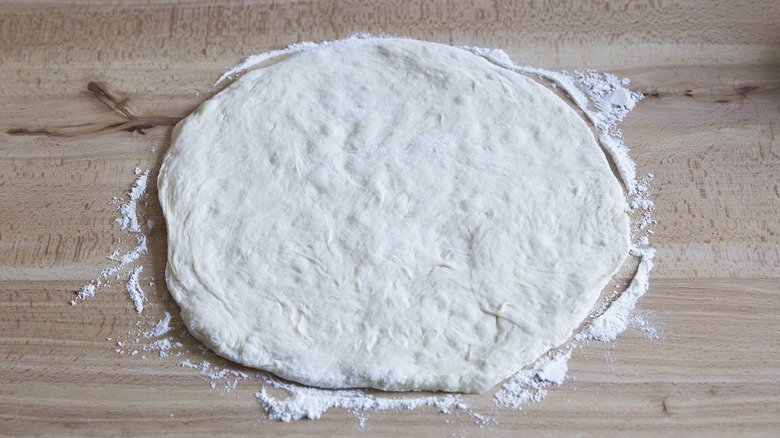 - Flip the dough and continue pressing it in the same way to gradually enlarge the disc until it reaches 12 inches in diameter. Be patient and don't pull the dough.