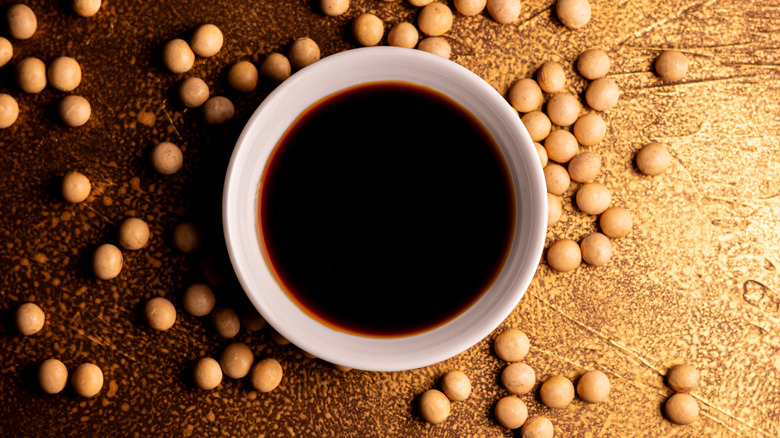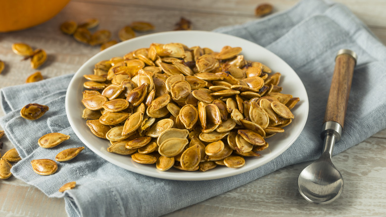 Roasted pumpkin seeds are an autumn tradition in many homes, as indicative of the season as apple cider, cranberries, and butternut squash. If saving and roasting pumpkin seeds hasn't yet made its way into your family's fall repertoire, perhaps it's time for some umami inspiration. Those seeds, cloaked in flat, oval, cream-colored shells, do tend to be a bit blasé when the only flavoring is a sprinkling of salt. But the transformative power of one single sauce sends these seeds into super-snack territory. We're referring to an increasingly standard Asian-style pantry item: Soy sauce.