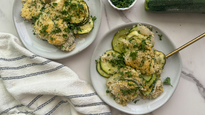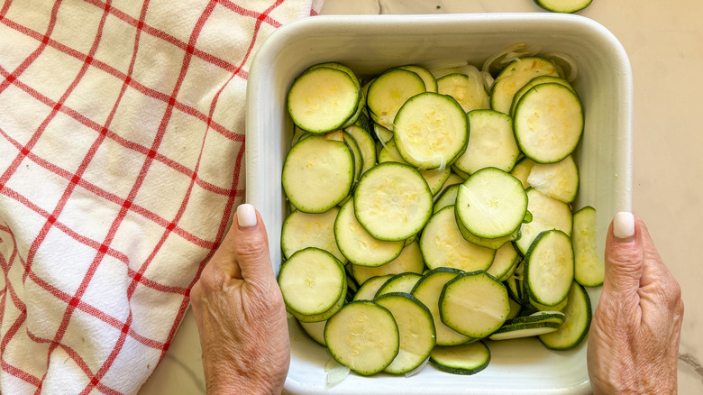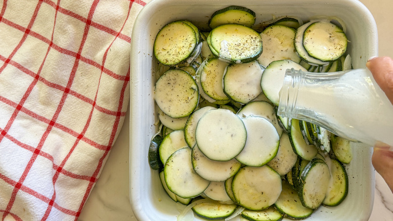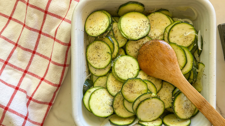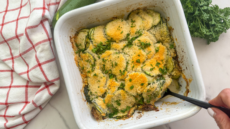 When you're trying to balance out a meal, a good veggie side dish can seal the deal for a memorable dining experience. Gratin — which comes from the French word "gratter," meaning to grate or scrape — refers to the texture of the golden and crispy topping that gratins are known for. This recipe highlights thinly sliced zucchini, savory aromatics, silky cream, and salty Parmesan to create a versatile dish that can sit on your weeknight dinner table or be a part of your holiday spread.