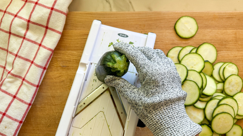 - Slice the zucchini about ⅛-inch thick either by hand or with a mandoline.
