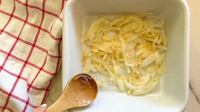 Layer the sauteed onion and garlic in the baking dish.