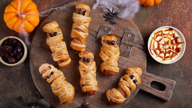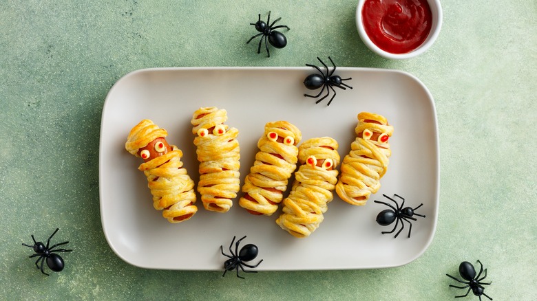 Even though they're called "pigs in a blanket," hotdogs wrapped in dough look nothing of the sort. Mummies in a blanket are a whole different story — and are the perfect addition to your spooktacular Halloween spreads. The best part is that this mummified snack is extremely easy to cook up.