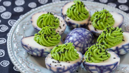 To continue in the spooky spirit of Halloween, we recommend adding a few drops of green food dye to your egg yolk mixture to give it the vibrant look of toxic sludge — Mmmmm! Our favorite part about deviled eggs is that there are endless ways to upgrade them. Consider adding things like crème fraîche for a creamier texture or wasabi paste to give the toxic sludge a spicy kick, or a simple squirt of lemon juice into the yolk to brighten the flavor.