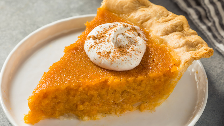 If you can't be bothered to make your own crust, you can still focus on giving your sweet potato pie filling some TLC. "If you want a little extra flavor, add a splash of bourbon," Smith recommends. "It's optional, but delicious." A few spoonfuls of booze can elevate some of the sweeter caramelized flavors in your recipe. Options with smokier tasting notes can complement the creaminess of the sweet potatoes, building layers of richness and complexity in your treat. When topped with crumbles of maple-cinnamon candied bacon, simple candied walnuts, or stovetop candied pecans and served with dollops of homemade honey whipped cream, your pie will make house guests may wonder if you attended a professional course to learn how to come up with a recipe this delicious.