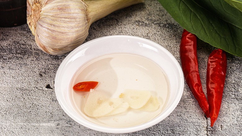 Also known as "dam toi," garlic vinegar is a staple of Vietnamese cuisine and Hanoi-style pho. This spicy condiment packs a punch of incredible flavor with tangy vinegar and earthy garlic that can be used on much more than just pho. What's more, it's super simple to make at home. The basic ingredients for garlic vinegar include cloves of fresh garlic that have been bruised or crushed, unseasoned rice vinegar, hot peppers, and water. Depending on your level of spice tolerance, you can use serrano or Thai chiles and moderate the level of heat by using more or less in your preparation. A 1:2 ratio of water to vinegar is ideal and you can adjust to taste. You can start using the garlic vinegar after storing it overnight and it can be kept for several months when refrigerated.