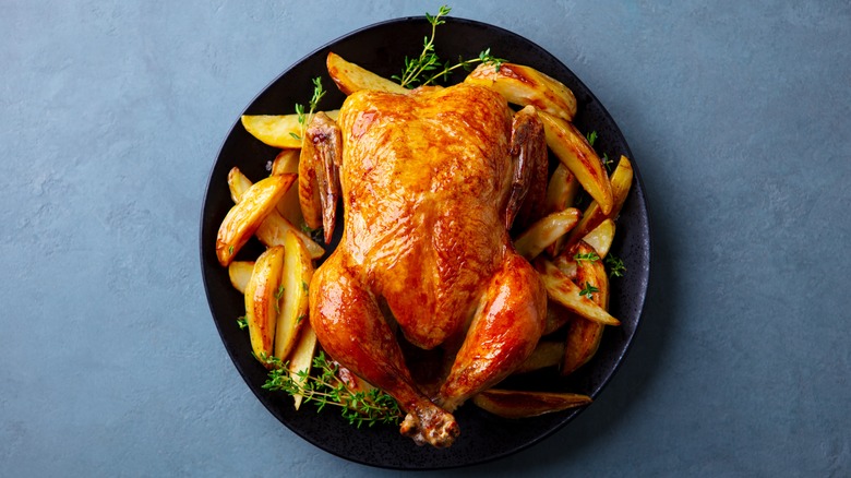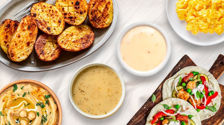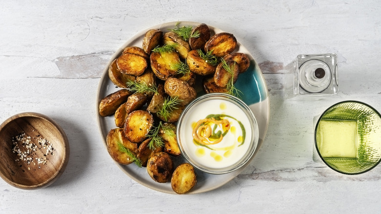 If you're looking for a drizzle, you can choose from almost any dressing out there, although we recommend steering clear of anything super sweet like light raspberry vinegarette or French dressing. Creamy dressings like ranch or Russian dressing are fan favorites, but an herb-based vinegarette can do the trick as well. Thicker dressings are great for dunking, while oil-based dressings can lightly coat the raw potatoes before cooking. Just be sure not to go too heavy on the liquid, as the potatoes would likely steam instead of get crispy. In fact, utilize some tips to get the crispiest potatoes if you go this route, and consider tossing a little cornstarch onto the spuds.