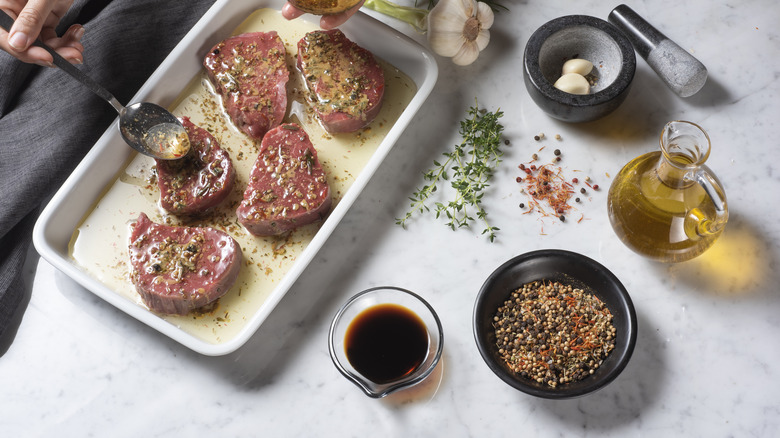 For red meat like steak, you can also use an Italian dressing. However, you have the option of a darker dressing like balsamic or soy sauce-based. Try using a plum or cherry balsamic for sweeter and richer notes. These stronger flavors of the balsamic don't overpower the robust flavor of red meat. Ingredients commonly found in dressing, like vinegar, lemon juice, and soy sauce, help break down the proteins or "tenderize" the meat. This is why they are also found in tenderizing marinades. Luckily, the two also usually contain garlic, spices, and herbs and can be quite flavorful when used as both a marinade and salad dressing. Any oil-based dressing, dark or light, also works for tofu and tempeh, which are quite versatile.