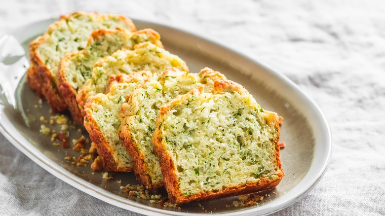 Cheddar cheese is a popular addition to other dense, quick-rising types of bread like cornbread or this loaded cornbread casserole. Its sharp flavor will bring a bold complement to the sweetness and richness of pound cake or even convert a classic dessert into a savory side dish. Cheddar will melt seamlessly into the cake as it bakes, creating gooey, melted pockets that'll bring its already mouth-watering texture to new heights. You can also melt the cheddar into a creamy wet mixture to stir into the batter for a cheese-flavored cake. Cheddar cheese will also create a crispy, toasted crust if you sprinkle a generous portion of shreds over the top of the loaf at the tail end of its stint in the oven. Not only are there various ways to incorporate cheddar into a pound cake, but its unique flavor also opens up the door for other fix-ins, glazes, and toppings.