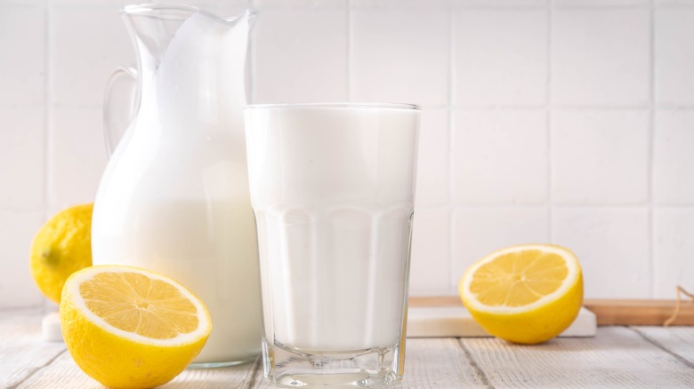 Buttermilk, a cultured dairy product, is essentially fermented milk. The fermentation process results in an acidic yet creamy liquid that is great for tenderizing meats, providing a creamy tanginess to dressings, and giving baked goods the fluffiest texture and most rise while ensuring they stay moist. It's a versatile ingredient to keep in your kitchen for any cooking or baking needs, but it's not vegan-friendly. Luckily, the master of vegan cooking, Nisha Vora, has shared the best dairy-free buttermilk substitute, and it only requires two ingredients. To make vegan homemade buttermilk, you can mix dairy-free milk with an acidic liquid such as apple cider vinegar or lemon juice.