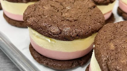 The success of your ice cream sandwiches depends upon the quality of the ice cream and the texture of your cookies. We've got a list of the best ice cream brands that will fit the bill. As for the cookies, a soft, chewy texture is ideal. In fact, the classic cookie sandwich cookie is more similar to a cake or whoopie pie recipe than a cookie. Some recipes opt for brownies. A chewy cookie or brownie will harden enough to keep its form and contain the ice cream, while still being easy to bite into. To ensure that the cookie doesn't get too hard, you'll want to store the cookie sandwiches in a covered container in the freezer. Covering the sandwiches will keep the cookies moist and help them absorb the extra moisture from the ice cream as the sandwiches harden overnight.