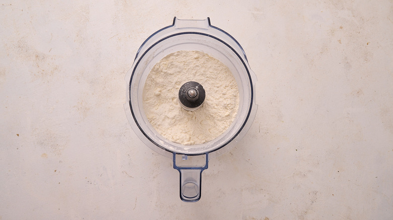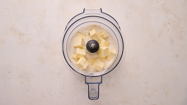To make the dough, combine the flour, salt, and butter pieces in a food processor.