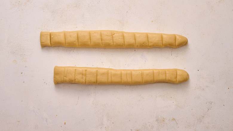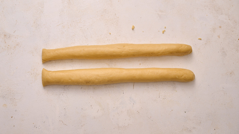 - Roll the dough into a ball and slice in half. Roll each half into a 1-inch rope.