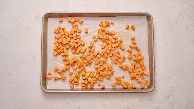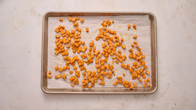 Arrange the sweet potato pieces on a parchment-lined sheet tray and drizzle with 1 tablespoon of olive oil.