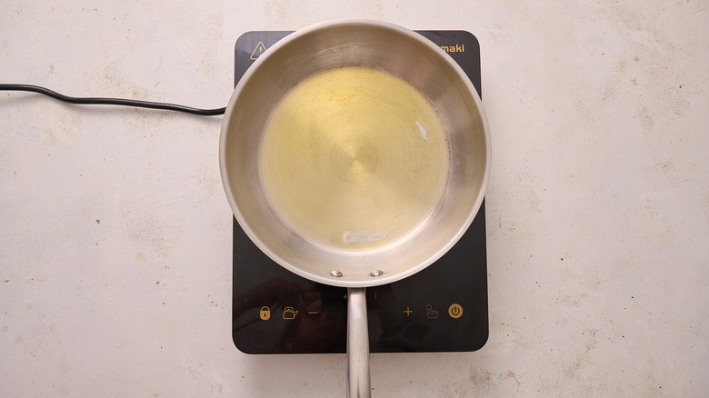 - In the meantime, heat the remaining oil in a skillet over medium heat.