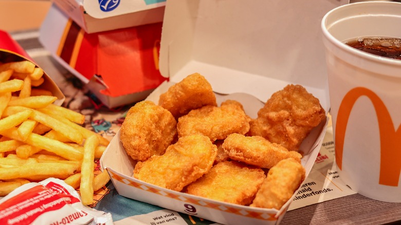 There may not be any pink ooze in McDonald's food (anymore?), but there may be another suspicious ingredient frequently used by the brand to keep in mind. It seems that the industrial chemical azodicarbonamide is baked into the McRib's rolls to strengthen their texture; its side effects likely include respiratory problems, hormonal imbalance, and increased intolerance to gluten. As for the McNuggets? McDonald's may use real chicken, but it is reformed nugget from a combination of breast, tenderloin, and rib meat.