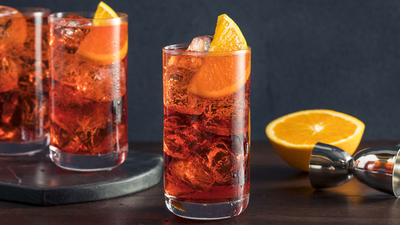 There are few things better than a refreshing cocktail on a hot afternoon, so much so that the biggest problem is that you can't drink more of them. There are plenty of beloved and refreshing alcoholic drinks, like daiquiris and margaritas, but as thirst quenchers, they all suffer from the fatal flaw of people not wanting to get hammered by downing four or five of them. But as luck would have it, that's just what spritz-style drinks exist for. Usually made with a mix of a liqueur or aperitif, wine, and sparkling water or soda, these low ABV recipes give you that little bit of a buzz you're after while being light enough that you can quaff a few of them with little worry about losing your faculties. And while the Aperol version remains the most famous, there is an even older, very underrated drink you can order in that spritz style: the Americano.