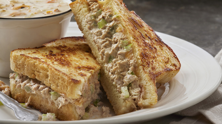 For tuna melt lovers who relish crunchiness, red onion and celery are key for tuna salad, but sometimes, crunch just isn't enough. A well-rounded sandwich needs a good texture, which those two essential veggies provide, but it also needs flavorful fillings that are present in every bite. Dijon mustard helps with both things: Because it's a creamy emulsifier, it helps combine all the ingredients, which ensures that you'll get all those delicious flavors in each bite. It also brings a tanginess to your sandwich, which, along with the lemon juice, will balance out the tuna's richness.
