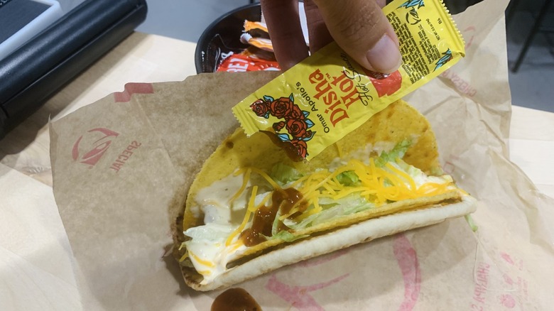 Following a busy summer when Taco Bell re-released classic menu items from across the decades, the chain invited Tasting Table to sample the new Disha Hot Hot Sauce packets just before their debut. Read on to learn what's so special about this spicy limited-time offering, how to snag a taste of it, and whether it lives up to the hype.
