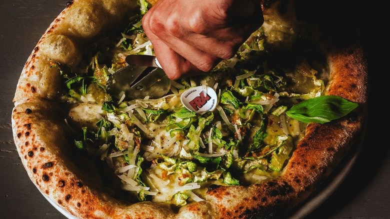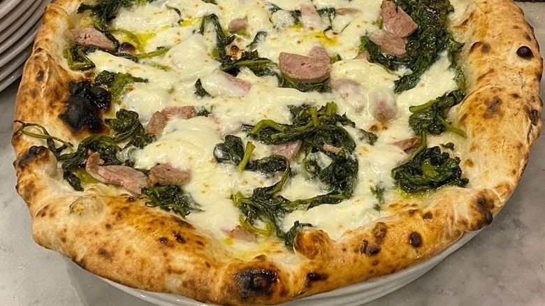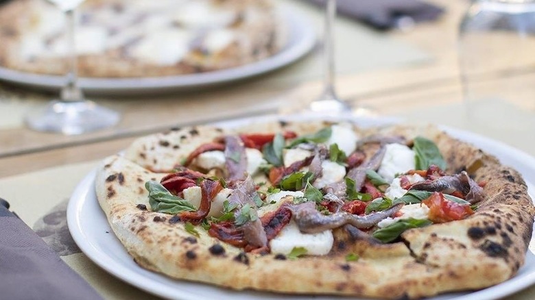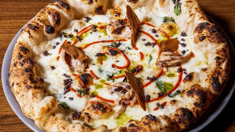 If you're looking for an unusual pizza that still keeps the list of ingredients pretty simple, consider the Fairy Zucchini at Fra Diavolo, a chain with a handful of restaurants throughout Italy. This one comes with mozzarella, cream of zucchini, mint, fried zucchini, provolone cheese, pepper, basil, and extra virgin olive oil, which you can order with a black charcoal crust — which, according to staff at Fra Diavolo, is easier to digest than regular pizza dough.